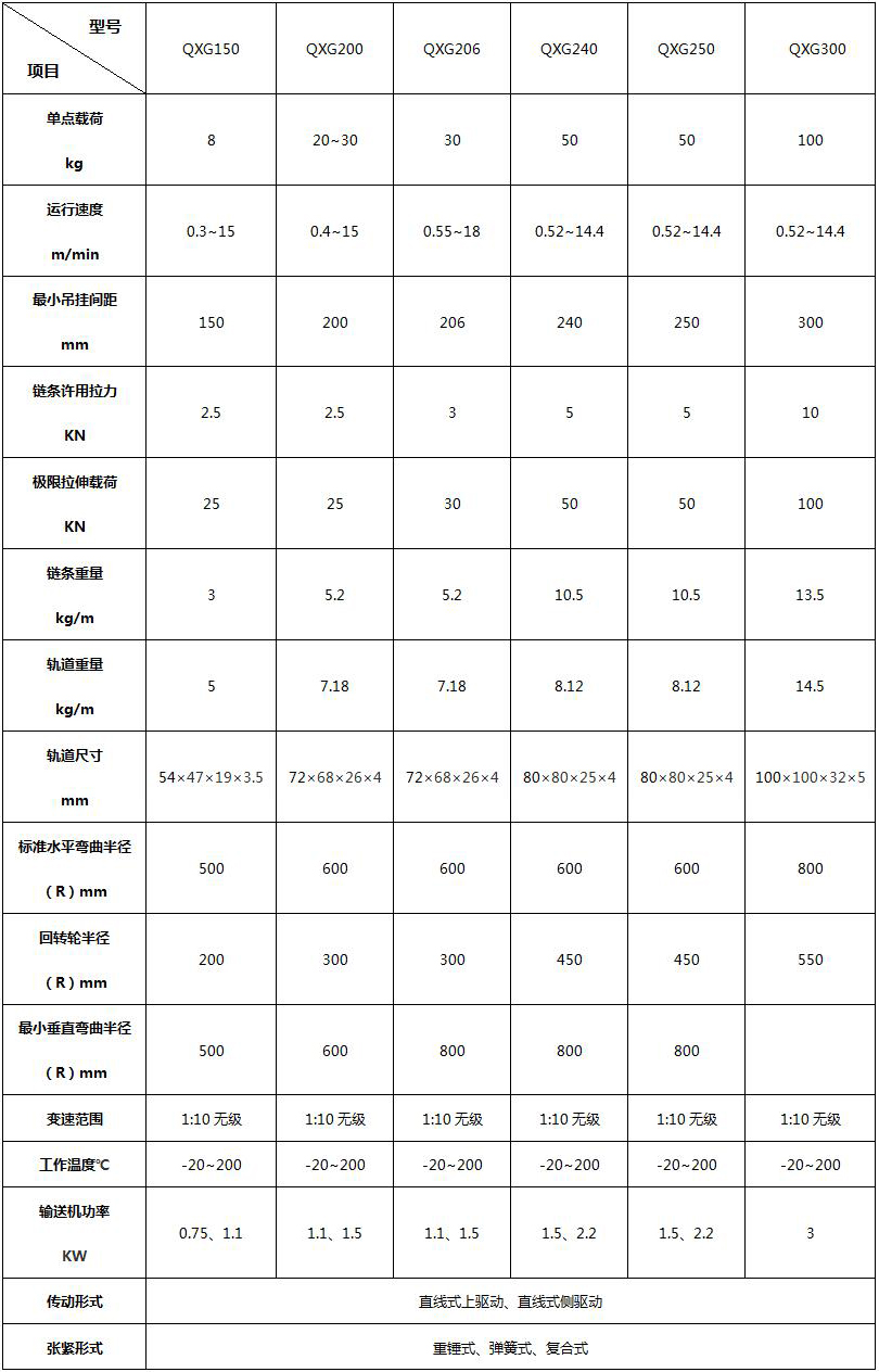 QXG150轻型悬挂输送机采用方形封闭轨道,十字块铰接链组合而成,呈环形封闭状。